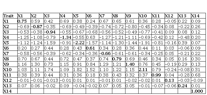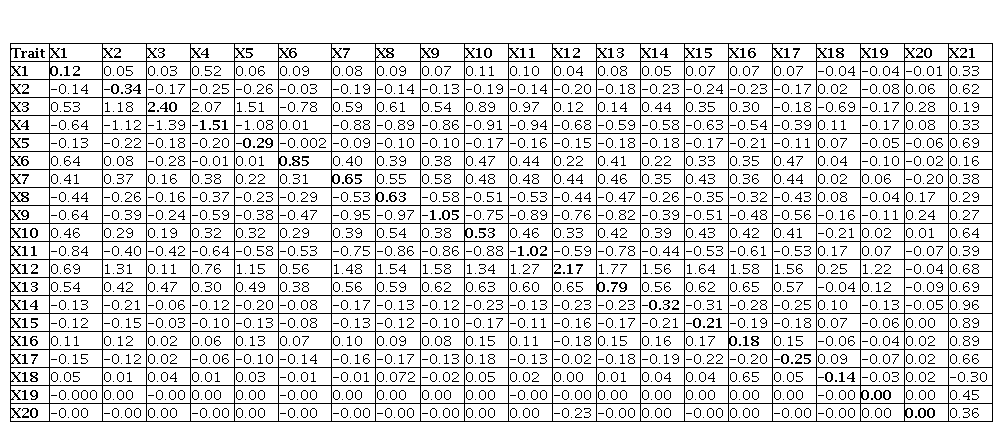 Phenotypic correlations of 34 characters both growth and yield quantitative characters namely, kernel breadth (mm), fresh weight of husk (g), number of bunches per palm, husk thickness (mm), dry weight of husk (g), fresh nut yield per palm (g), recovery percentage (%), bunch weight per palm (g), fresh kernel weight per palm (g), fresh weight of husk per palm (g), dry weight of husk per palm, (g) number of inflorescence, plant height (m), crown length (m), girth (m), inter nodal length (m), number of fronds , number of leaflets , length of oldest leaf (m), breadth of oldest leaf (m), length of leaf sheath (m), breadth of leaf sheath (m), number of female flowers per inflorescence, number of nuts per palm, fruit length(mm), fruit breadth (mm), fresh fruit weight (mm), kernel length (mm), fruit volume (cc), dry weight of kernel (mm), Total chlorophyll content (μg /g) and number of nuts per inflorescence fruit yield per palm (g) presented in Table 1and 2. Mean data was subjected for study of correlation and path coefficient as suggested by Miller et al. (1958) and Dewey and Lu (1959) respectively.