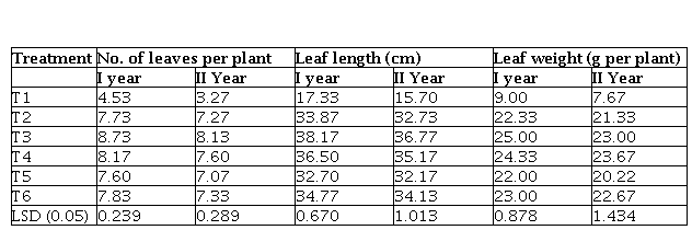 Data on various attributes pertaining to plant growth and yield including number of leaves per plant, leaf weight and length, root weight, length, diameter, plant biomass and yield were recorded, and statistical analysis was done as per ANOVA techniques, while means’ comparison was done by Duncan’s multiple range (DMR) test.