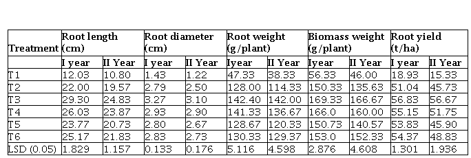 The different treatments significantly influenced root length, root diameter, root weight, biomass weight and root yield (Table 2). Application of poultry manure (PM) in addition to NPK produced significantly higher values for root length (29.30 and 24.83 cm), which