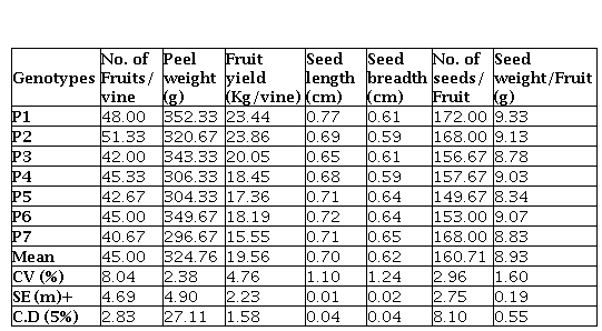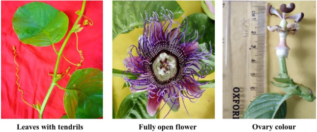 Flowers are 8.40 to 9.41 cm in length which was maximum among other cultivated passion fruit. Significant variation for quantitative traits like peduncle length, fruit length, fruit breadth, fruit weight and peel weight, seed length, seed breadth, number of seeds/fruit and weight of seeds/fruit were recorded (Table 2a and 2b).