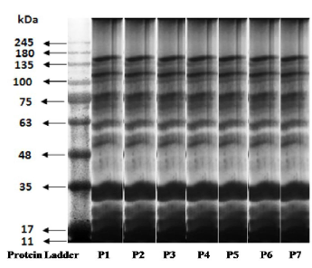 Present investigation recorded a total 70 numbers of bands having molecular weights ranging from 11 KD to 163.53 KD. All the seven selected genotypes found in East Siang District, Arunachal Pradesh exhibited monomorphic banding pattern in the protein profiling of giant granadilla. Beena and Beevy, (2015) also reported the highest molecular weight i.e., 69.94 KD was generated by Passiflora foetida var. hispida, while the lowest (12.95KD) was produced in Passiflora foetida var. gossippifolia in Passiflora species.