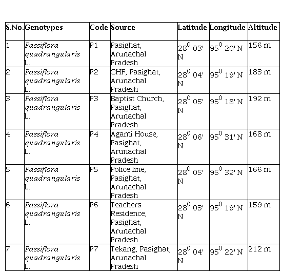 This novel P. quadrangular is helps the rural sectors in mitigating the malnutrition and hence enabling them a quality life. During investigation it was observed that P. quadrangularis L. is grown by the Adi tribe of Arunachal Pradesh and sold as squash in the market. However, very few systematic, inventory and documentation about the Passiflora species found in Northeast India and sporadic attempts have been made on characterization of passion fruit found in Arunachal Pradesh. Therefore, the present research was initiated to explore and document for the morphological and biochemical characteristics features of P. quadrangularis L. found in East Siang district of Arunachal Pradesh.