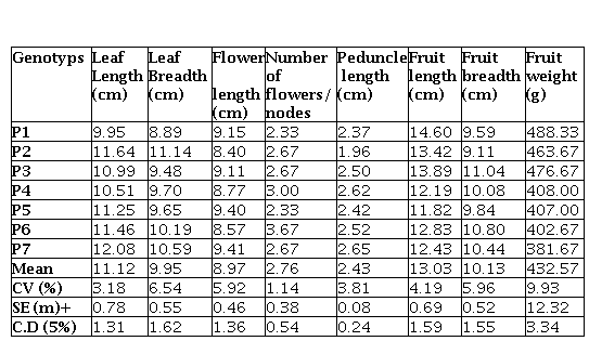 Morphological characters are important for identification and documentation of horticultural traits for crop improvement. A large variability having unique characters was recorded for morphological traits of fruits and other plant parts of the collected giant granadilla (Fig 1a and Fig 1b). There are no significant variations in different qualitative traits recorded. All the accessions had quadrangular stem, large green cordate leaves having entire margin and leaf lamella. Leaf had deep sinus, stipule and heterophylly was absent. All the lines showed axillary tendrils bearing 2.33 to 3.00 flowers/node. Flowers had light red color petals and sepals are green from outside and whitish pink from inside with yellowishgreen ovary. The flowers possess yellowish green stamens with violet dots, blue, brown speckled corona. All the lines produced light yellowish brown oblong fruits possessing dark brown seeds. The same qualitative characters were also reported by Lim, 2012. Among the genotypes leaf length varied from- 9.95 to 12.08 cm, leaf width from-8.89 to 11.14 cm.