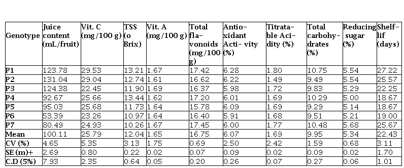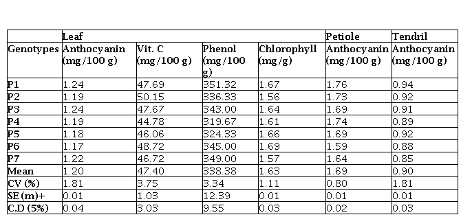 Chlorophyll content of leaves were ranging from 1.56 to 1.69 mg/g which was an agreement with Do Valle et al. (2018). Phenol content was as 319.67 to 351.32 mg/100 g of fresh leaf and similar data was reported by Rudnicki et al. (2005) and Marroquin et al. (2011). Anthocyanin (mg/100 g) content in leaf, petiole and tendril varied from 1.17 to 1.24 mg/100 g, 1.59 to 1.76 mg/100 g and 0.85 to 0.94 mg/100 g respectively which was in agreement with Aizza et al., 2019 and Reis et al., 2018. The anthocyanin, phenol and chlorophyll concentration of petioles, tendrils and leaves might differ according to a variety of external and internal factors such as genetic, agronomic and climatic factors (Kayesh et al., 2013). Shelf life (days) of Passiflora quadrangularis genotypes at room temperature was recorded maximum for genotype P1 which is 27.22 days at room temperature. It is due to