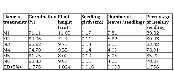 Seedling girth: The significantly higher seedling girth (0.17 cm and 0.15) was recorded with M1 i.e., Vermiculite + Perlite + Vermicompost (1:1:2) in brinjal and chilli, respectively, while the lowest values were recorded in M5 in both the crops.