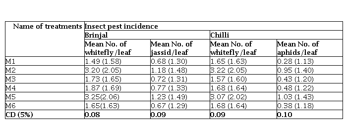 it can be concluded that significant difference in incidence of insect pest occurs on these seedlings that may be attributed to different growth factors. These findings are in agreement with Islam et al. (2017), who reported that infestation behaviour of the whiteflies could be affected by the quantity of plant released volatile organic compounds that depends on availability of nitrogen content in the plant. Above results are also in agreement with studies conducted by Mahala and Sharma (2020) who reported that there was effect of growing media on the insect pest incidence in tomato seedling.