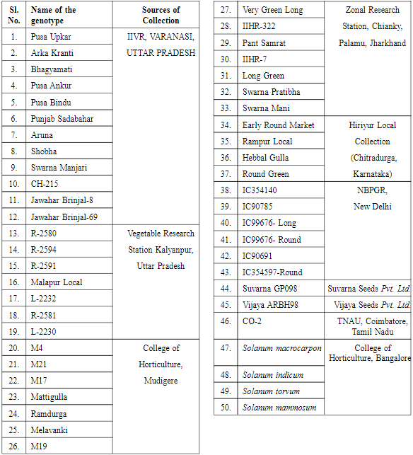 Country wide collected fifty eggplant genotypes (Table 1) were sown in portray after treating with carbendazim and etiolated for three days and after 30 days of sowing seedlings were transplanted into pots. Experiment was designed with factorial completely random design which includes two factors viz., (a) drought conditions (Normal moisture condition/control
