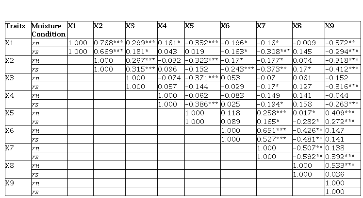 and moisture stress condition); (b) 50 eggplant genotypes with three replications. Moisture stress was induced for about 15 days during two critical stages of eggplant i.e., flower initiation and fruit initiation stage. Furthermore, drought level was monitored by tensiometer regulated at 85 centibars. Upon experimentation, traits like number of days taken for flower initiation, plant height, total plant length, number of primary branches per plants, fruit length, fruit circumference, average fruit weight, number of fruits per plant, fruit yield per plant were recorded. Phenotypic correlation coefficient was done for moisture stress (rs) and normal moisture condition (rn) with the help of WINDOWSTAT V.7.2.