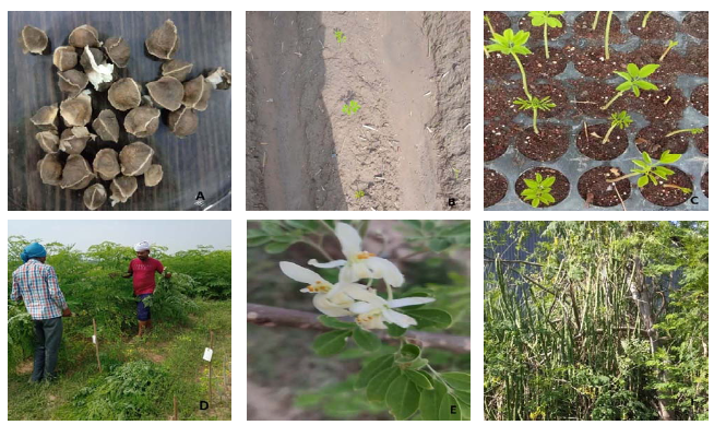 utilized. For good seed production, 2-3 seeds per hole are planted 2-3 cm deep with 2-5 meter spacing between trees depending of the annual or perennial types. For good leaf production, dense planting should be done i.e., 30 cm x 10 cm spacing. When the trees reach about 1.5 m tall, prune them down to 15 cm. The pruned rows grow back with a greater number of branches and leaves. It gives a continuous supply of leaves. Plantation can be done from cuttings having diameter 4-5 cm and length 100 cm; by digging a hole, adding manure and mounding the soil (Peter, 1978). The sprouting takes variable time depending on various factors like genotype, length of cuttings and growth conditions. However, plants grown from cuttings are sensitive to winds and drought due to lack of strong root system. It can also be cultivated through nursery raised saplings. The saplings are grown in plastic bags having sandy or loamy soils. Saplings have tender roots and hence transplanted carefully when attain the height of about 30 cm.