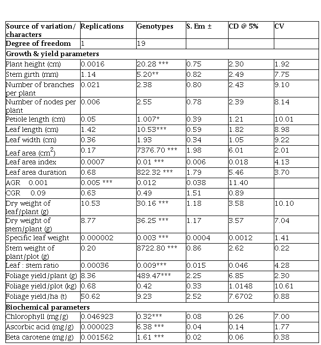 In the present study, totally twenty genotypes were evaluated to know the extent of variability for growth, yield and quality parameters. The analysis of variance indicated highly significant differences among genotypes for all the characters viz., plant height, stem girth, number of branches per plant, leaf length, leaf area, leaf area index, petiole length, leaf area duration, absolute growth rate, specific leaf weight, foliage yield per plant, total yield per plant, chlorophyll content, ascorbic acid content and beta-carotene content. Thus, it is implied that there was reasonably sufficient variability in the material used for the study, which provides ample scope for selecting superior and desired genotypes by the plant breeders for further crop improvement.