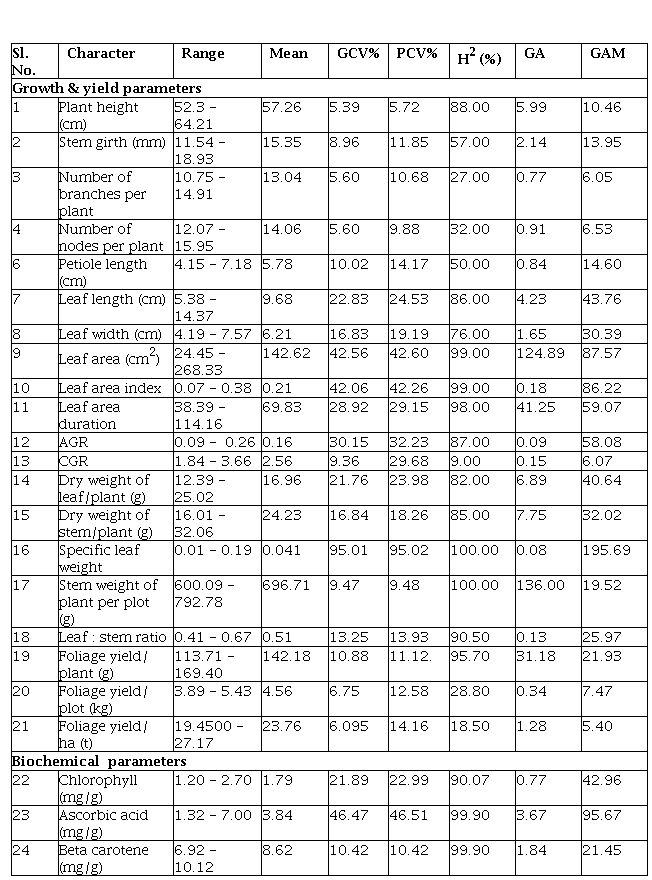 The analysis of variance indicated that significantly higher amount of variability among the genotypes for growth and yield parameters viz., plant height, stem girth, leaf length, number of branches per plant, leaf width, stem girth, petiole length, leaf area, leaf area index, leaf area duration, absolute growth rate (AGR), dry weight of leaf per plant, dry weight of the stem per plant, specific leaf weight, stem weight of plant per plot, leaf :stem ratio, foliage yield per plant, foliage yield per ha, total yield per plant. Similarly, the quality traits viz., ascorbic, beta carotene, total chlorophyll were found to have higher variability Tejaswini et al. (2017). The results are presented in the Table. 2.