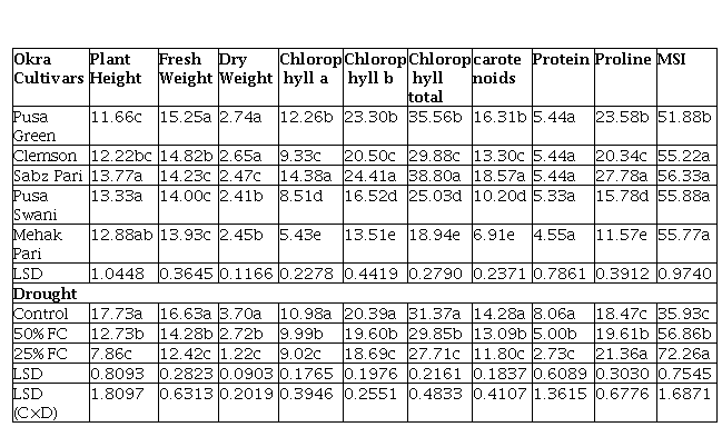 Study was conducted to evaluate the adverse effects of a drought on different okra cultivars and to identify the most suitable okra cultivar for growing in drought conditions. The results obtained for various plant phenotypical and biochemical parameters studied are given in the Table 1.