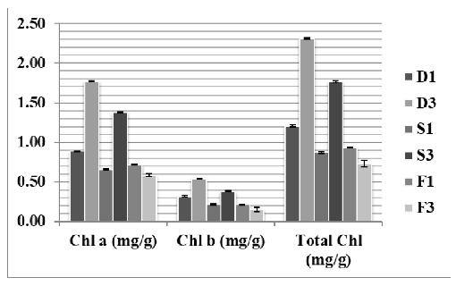 Differences in chlorophyll content in micro-shoots were influenced by treatments (Fig. 1). Highest values of photosynthetic pigments viz. Chl a (1.77 mg/g), Chl b (0.54 mg/g) and total chlorophyll content (2.31 mg/ g) were reported from shoots cultured on medium containing 3% glucose. This means, treatment D3 not only produced a greater number of shoots, but also had higher accumulation of photosynthetic pigments in them. Such improvement in chlorophyll concentration with increment in quantity of carbon source in the medium has been reported by Capellades et al. (1991) in rose. On the contrary, the lowest values for photosynthetic pigments (0.58 mg/g, 0.15 mg/g and 0.73 mg/g) were observed in shoots derived from cultures grown on F3. This suggested specificity
