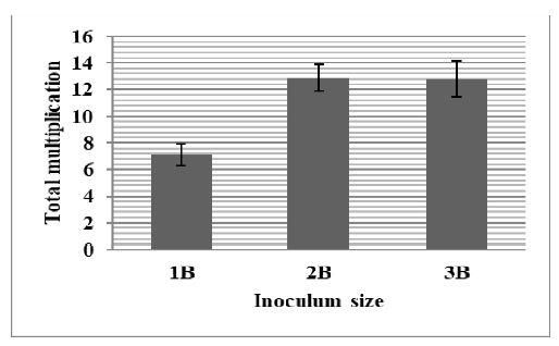 Optimum explant density is one of the key determinants for success of a micropropagation protocol. In the present study, culture multiplication improved from 7.1 (one bud) to 12.9 (two bud) and 12.8 (three bud) (Fig. 2 and 3). As there was no significant difference between two and three bud explant, it is recommended to use two bud inoculum as it would reduce the explant requirement without compromising the multiplication ratio. Influence of explant density on culture multiplication has been reported in turmeric and globe artichoke (El-Hawaz et al., 2015; El Boullani et al., 2017).