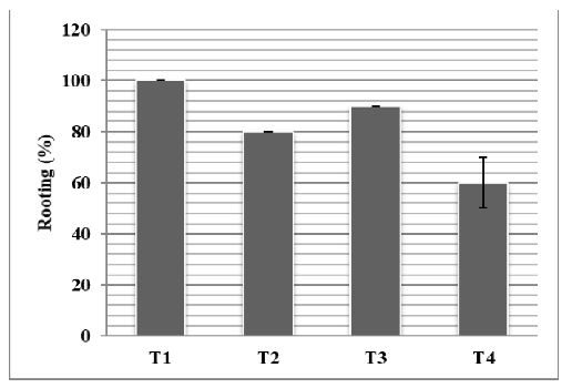 Single step ex vitro rooting cum hardening has been considered as an efficient method to reduce time, labour and other operational costs (Ranaweera et al., 2013). This is particularly relevant in cases wherein planting material requirement per unit area is higher as in case of present species. During present study, root induction and hardening was possible without external auxin application (Fig. 4). In fact, auxin dip had adverse effect on these parameters. All the micro- shoots treated with deionized water (control) showed 100% establishment and rooting percentage got reduced to 60% at the highest (1,000 mg/L) concentration of IBA (Fig. 5). Being a rhizomatous species, each micro-shoot carried a small part of rhizome at the base and when transferred to the substrate ex vitro, it might have given the stimulus for root induction as seen in case of rhizome sett grown plants.