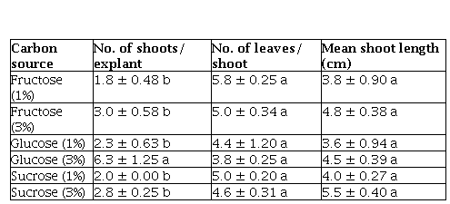 Alteration of carbon source or its content had no influence on number of leaves per micro-shoot (3.8 to 5.8) and mean shoot length (3.6 cm to 5.5 cm). Interestingly, despite producing highest number of shoots, medium supplemented with glucose (3%) could not improve leaf production and shoot length. It was probably due to utilization of energy for shoot bud proliferation rather than for leaf production. Previous studies on banana have also suggested significant role of carbon source (sucrose/dextrose/ fructose, when used alone) on shoot multiplication, while there was no significant difference in mean shoot length (Madhulatha et al., 2006).