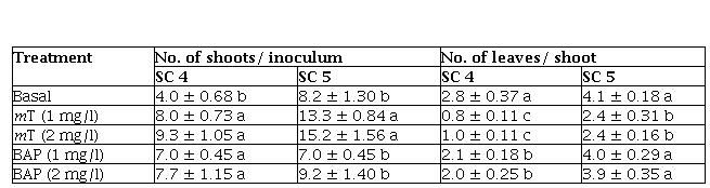Effect of two cytokinin viz. 6- benzylamino purine (BAP) and meta topolin (mT) at 1 mg/L and 2 mg/L was studied during subculture 4 and 5. Growth regulator free MS medium was used as control. During subculture 6, both levels of mT were compared with MS basal medium. Media also contained 0.2 mg/L naphthalene acetic acid (NAA) and glucose (3%) as carbon source. Experiment was laid in CRD with six replications each during subculture 4 and 5 and nine replications during subculture 6.