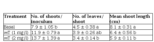 During subculture 6 also, similar trend was maintained in which 13.7 and 11.9 shoots/ culture were obtained in medium supplemented with 2 mg/ L and 1 mg/L mT as against 7.9 shoots/culture in MS basal medium (Table 3). Superiority of mT in long term culture has previously been reported (Wojtania 2011), thereby suggesting the superiority of mT observed in present study. About 4.5 leaves/ shoot were produced in control, which remained on par with shoots obtained from 1 mg/L of mT (3.9 leaves/ shoot). Longest shoots (8.1 cm) were noticed in cultures grown onto basal medium and increase in mT concentration resulted in decrease in shoot length to 6.4 cm and 5.9 cm.