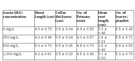Concurrent ex vitro rooting cum hardening was studied in which effect of three concentrations of indole-3- butyric acid (IBA, 250, 500 and 1,000 mg/ L) was compared with de-ionized water as control. Micro-shoots of ca. 3 cm were excised and washed with water to remove adhering agar. Basal parts of the micro-shoots were dipped in the solution (30 s) and planted in cups of 200 ml capacity filled with coir pith as a substrate. Plantlets were covered with polythene bags to maintain humidity during hardening. Experiment was laid in CRD. Survival and growth parameters were recorded after 7 weeks of transplanting. For establishment, two replications of ten plants each were used, while for growth observations, ten plants were used.