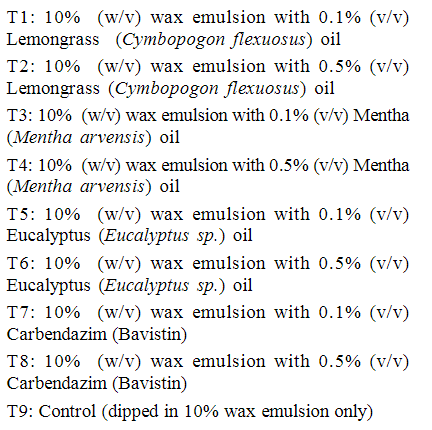 The essential oils used in the experiments were prepared at Herbs Production and Processing Corporation Limited (HPPCL), Koteshwor, Kathmandu. The respective herbs collected from the Terai region of Nepal were dried, wilted and steam distilled to produce oils. One milliliter and five milliliter of essential oils were added in one liter of 10% wax emulsion to prepare 0.1% and 0.5% essential oils with wax emulsion. Similarly, the fungicidal solution of carbendazim was prepared by dissolving 1 g and 5 g of carbendazim (Carbendazim 50% WP) in 1000 ml of distilled water. One milliliten and five millititen of fungicidal solution were added in one liter of 10% wax emulsion to prepare 0.1% and 0.5% carbendazim with wax emulsion. The fruits were then dipped in the designated solutions for a few seconds, until a glossy film of wax was formed on the surface of fruits.