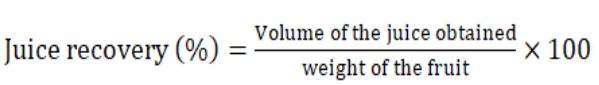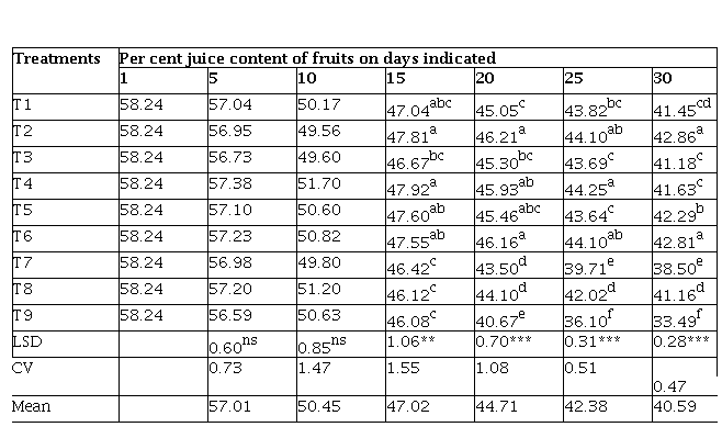 The data about the Juice content, fruit firmness, Total Soluble Solids (TSS), Titratable Acidity (TA), vitamin C (ascorbic acid) and disease severity scoring was taken at every 5th day interval. The physical (fruit firmness) and chemical (juice recovery percentage, TSS, TA and vitamin C) properties of fruits were measured by destructive sampling technique. The fruit model having 8 mm tip) and TSS was measured by hand refractometer. Acidity and vitamin C was determined as per the procedure outlined by AOAC (2005). The juice recovery percentage and content was calculated by following formulae;