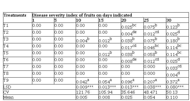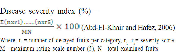 Abd-El-Khair and Hafez, 2006). The rotted fruits from each replication were removed and counted. Disease severity index of decay fruits by pathogen was calculated by following formulae;