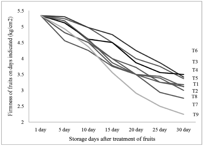 The fruit firmness decreased with the advancement of the storage period in all treatments (Fig. 1). On the day of the experimental setup, the fruit firmness was found to be 5.35 kg/cm2. On the 30th day after storage, firmness was highest for wax with 0.5% eucalyptus (3.50 kg/cm2) and lowest in control (2.25 kg/cm2) followed by wax with 0.1% carbendazim (2.75 kg/cm2).