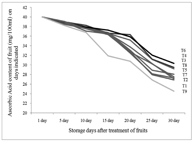 Vitamin C content is an important nutritive parameter in citrus fruits and it was decreased gradually during the advancement of storage days (Fig. 2). On the first day of storage, the vitamin C content was measured to be 40 mg/100ml of orange juice. On the 30th day, the highest vitamin C was found in fruits coated with wax and 0. 5% eucalyptus (30.31 mg/100ml), followed by wax with 0.5% mentha (29.50 mg/100ml) and 0.1% mentha (29.18mg/100ml), while the lowest vitamin C was observed in control fruits (24.5 mg/100ml).