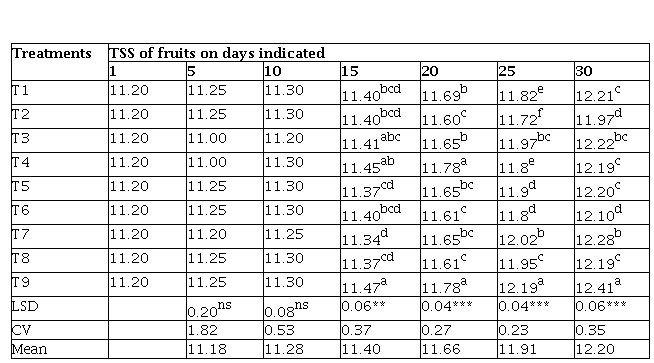 Total soluble solid directly influences the taste of sweet orange. The TSS of fruit on the first day of storage was 11.20 °Brix. TSS increased with increment in the storage period in all treatments from 10 days onwards (Table 3). However, TSS was found to decrease on the 5th day of storage for the treatment wax with mentha. There was no significant difference between treatments on the 5th and 10th day of storage. The highest TSS was observed in control fruits (12.41° Brix) followed by wax with 0.1% carbendazim (12.28° Brix) while the lowest TSS was observed in wax with 0.5% lemongrass (11.97° Brix) at 30th day after storage.