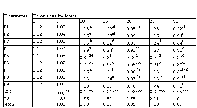 Table 4: Effect of postharvest treatments on TA of sweet orange fruits