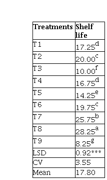 The wax treatment with carbendazim and essential oils had a significantly better shelf life as compared to the control treatment (Table 6). Wax with 0.5% carbendazim (28.25 days) being the highest and significantly better than other treatments. It was followed by wax with 0.1% carbendazim (25.75 days), wax with 0.5% lemongrass oil (20.00 days) and wax with 0.5% eucalyptus oil (19.75 days). The control fruits (8.25 days) were observed to have the lowest shelf life.