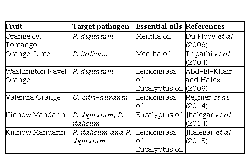 The green mold is the major postharvest pathogen in sweet orange. The chemical fungicides have been found effective against such pathogens, but the health hazard of such pesticides is alarmingly high. The use of essential oils as an alternative for chemicals can be an environment friendly technique for prevention of the health hazards. The shelf life of sweet orange can be extended by infusing wax with carbendazim or essential oils. But the superiority of essential oils especially wax with 0.5% eucalyptus oil and 0.5% lemongrass in qualitative parameters as well as in consumer’s preferences, organic requirements and environmental aspects make them a better alternative.