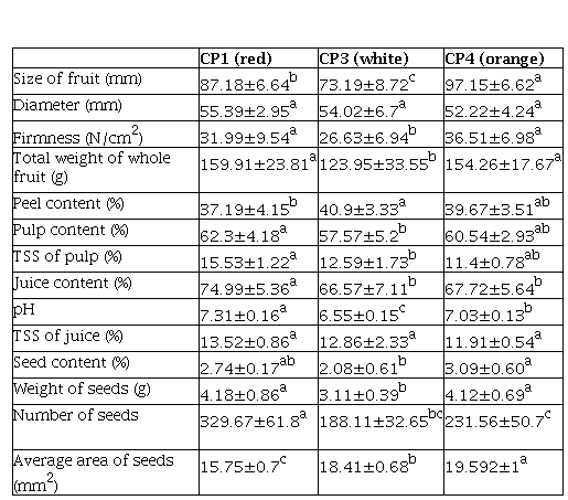 Red cultivar (CP1) was characterized by the significantly higher content of pulp (62.3%), TSS of pulp (15.53 Brix) and juice (13.52%), juice content (74.99%), and lower content of peel (37.19%). Significant differences in the pH of the three cultivars were observed with values between 6.55 (CP3) and 7.31 (CP1).