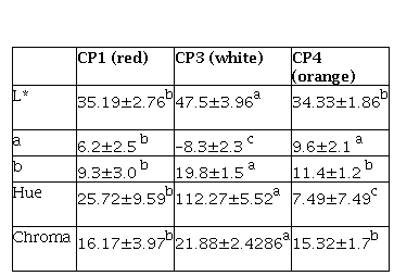 Table 2 shows that the three cultivars had L* values less than 50, the CP3 (white) was the closest with (L= 47.5), so it is the one with the least dark color. Between CP1 (red) and CP4 (orange) cultivars, no significant differences were observed for lightness. Hue values suggest that there are three types of shades; white with high hue values (112.27), red with intermediate value (25.72) and orange with low hue values (7.49). The highest chroma values were also presented by CP3 (white) (21.88), CP1 (red) and CP4 (orange) obtained very close values (16.17 and 15.32) respectively.