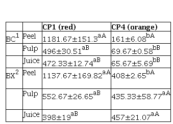 Betalain content was measured in CP1 (red) and CP4 (orange) cultivars, in the peel, pulp and juice of prickly pear. The CP1 cultivar showed higher betacyanins (BC) and betaxanthins (BX) content than CP4 (orange) with values of 1181 and 1137 µg/g d.w in peel, respectively for CP1 (red) and values of 161 and 408 µg/g d.w in peel for CP4 (orange), respectively. These compounds are responsible for the red and orange shades respectively.