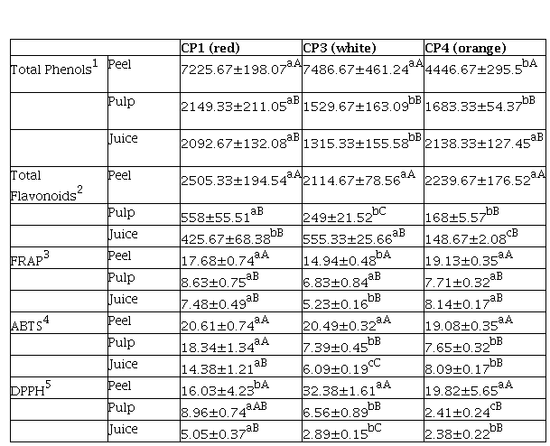 Table 4 shows the content of total phenols in the peel, pulp and juice of the three cultivars evaluated. CP1 (red) and CP3 (white) presented the highest Total phenols content (TP) in peel (7225.67 and 7486.67 µg GAE. g-1 dw, respectively), which was significantly different for CP4 (orange), which obtained 59.39% with respect to the CP3 (white) cultivar. No significant differences were found in the total flavonoid content in the peel of the three selections studied (2505, 2114 and 2239 µg QE g- 1 d.w) respectively.