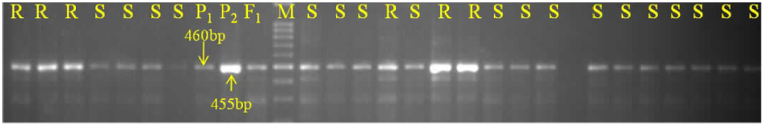 (P1- Arka Prasan, P2- IIHR-Sel-1, F1-Hybrid, S-Susceptible, R-Resistant and M-100 bp ladder)