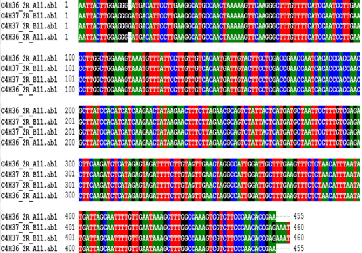 (C4H36_2R_All.ab1 and C4H36_2R_All.ab1 corresponds to genomic sequence of the amplified segment of the resistant genotype, IIHR-SEL-1 and susceptible genotype, Arka Prasan respectively)