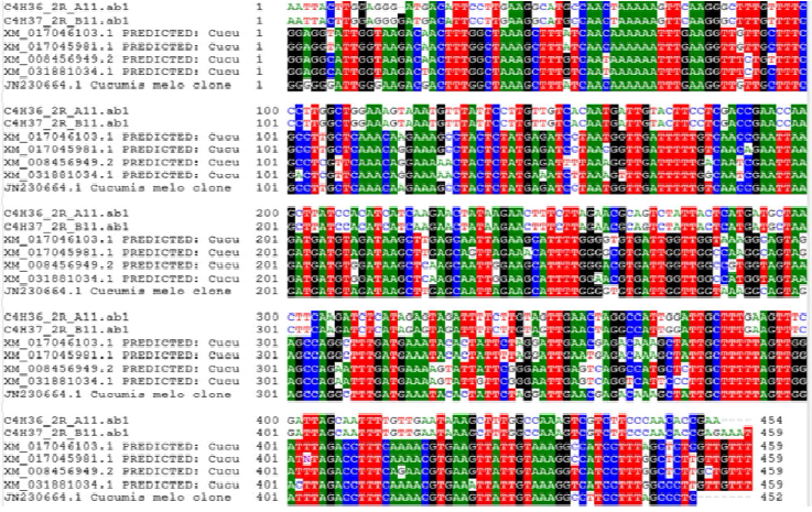 (C4H36_2R_All.ab1 and C4H36_2R_All.ab1 corresponds to genomic sequence of the amplified segment of the resistant genotype, IIHR-SEL-1 and susceptible genotype, Arka Prasan respectively. Amplified genomic sequence was aligned with mosaic virus resistance genes available in public domain www.ncbi.com)