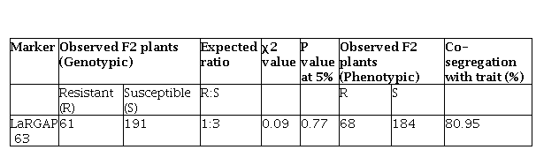 The molecular markers with polymorphism between resistant and susceptible parents were selected. Primers showing polymorphism between the resistant and susceptible parents were used to screen the segregating F. population. The goodness of fit of the observation from the F. plants’ genotyping with the expected Mendelian ratio was tested using chi-square analysis (Panse and Sukhatme, 1985).