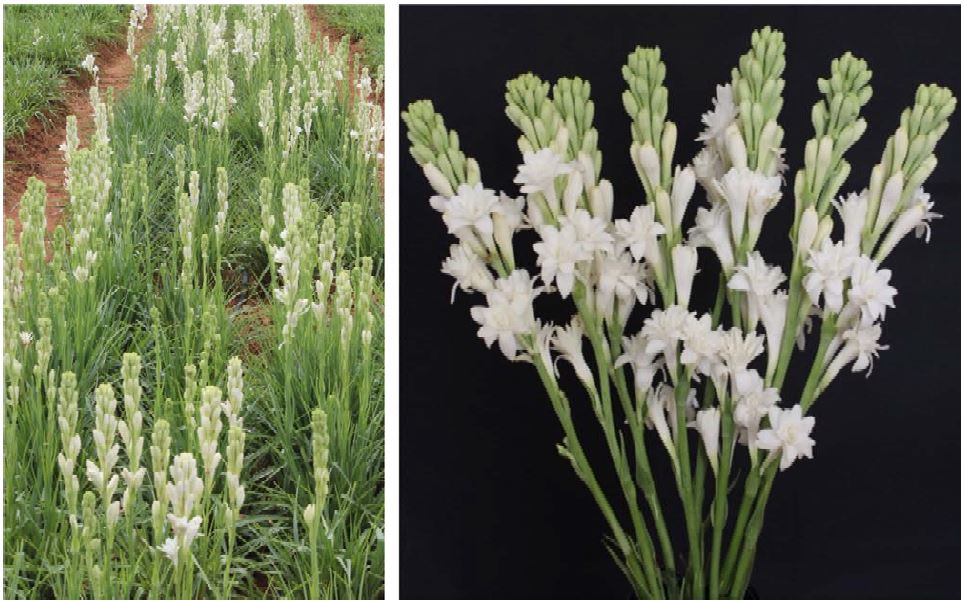 Tuberose (Polianthes tuberosa Linn.) is an important tropical bulbous ornamental plant belonging to the family ‘Asparagaceae’ and is native to Mexico (Bailey, 1919). There are two types of tuberose namely, Single and Double which are commercially cultivated across the globe for their exquisite flowers. Single types are used as loose flowers for garland purpose and perfumery industry whereas double varieties are highly preferred for cut flower and bouquets because of the longer keeping quality of the flower spikes. Double tuberose flowers have high demand in both local and international markets and are being exported to gulf countries. The increasing demand for superior and novel double type tuberose necessitates the development of varieties of this category. Tuberose is commercially cultivated in India in an area of about 16,190 ha, with a loose flower production of 1, 07, 910 metric tonnes and cut flower production of 89.29 lakh numbers of cut stems (Anon, 2016). Root knot nematode infects tuberose and leads to 10-14% of crop loss (Khan and Reddy, 1992). Leaf blight disease caused by Alternaria polianthi is extensive in tuberose growing regions of the country. Development of tolerant and resistant varieties to these biotic stresses is the need of the hour to help the tuberose growers. Keeping these objectives in view, an advance breeding line of double type tuberose (IIHR-4) developed by ICAR-IIHR was evaluated for flowering, yield, quality and reaction to root knot nematode and A.polianthi leaf blight disease.