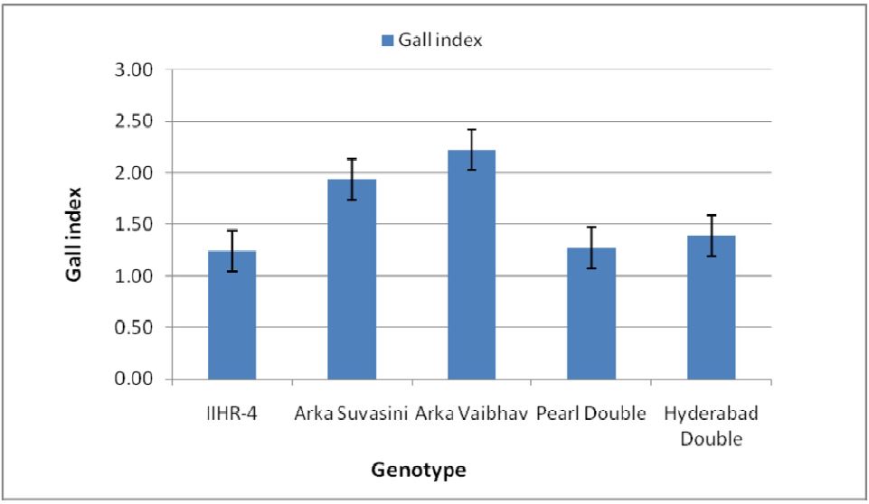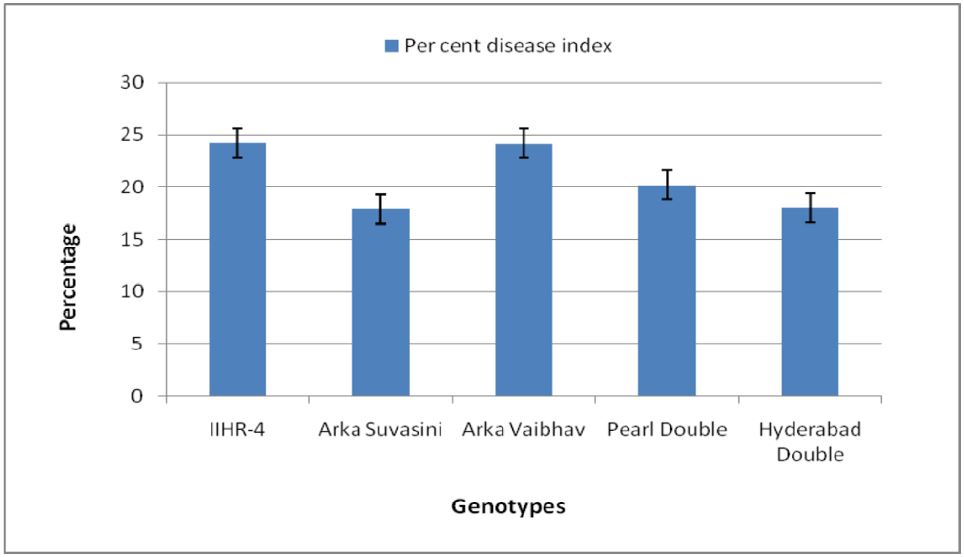 The advanced breeding line IIHR-4 was screened for the tolerance/ resistance against root knot nematode M. incognita for three consecutive years and the pooled analysis revealed that it was highly resistant under field conditions with least gall index of 1.24 (Fig. 1). Variations of tuberose genotypes for root knot nematode tolerance and resistance were reported earlier by Gandhi et al. (2018) who stated that this might be due to the inherent genetic character. Per cent disease index and host reaction of tuberose genotypes against leaf blight disease caused by Alternaria under field conditions were recorded and the results indicated that the breeding line IIHR-4 has better field tolerance to Alternarialeaf blight as compared to the other tuberose genotypes evaluated (Fig. 3).