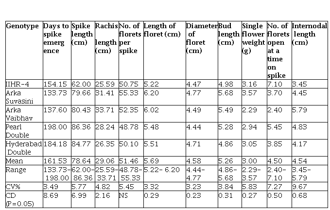 According to Bharathi and Umamaheswari (2018), the trait internodal length indicates compactness of the florets arranged on rachis, which is the ideal character for the selection of suitable cut flower. In the present investigation, internodal length between florets ranged from 3.45 (IIHR-4) to 5.79 cm in Arka Vaibhav with the general mean of 4.54 cm. Among the double types evaluated, the line IIHR-4 recorded the shortest internodal length and the florets are arranged very densely on the spike. In agreement with findings of the present study, the highest internodal length in Arka Suvasini was reported by Singh and Singh (2013) in tuberose under Delhi condition. Variation in the internodal length might be due to the genetic makeup of the cultivars under study and similar observations were reported by Bharathi and Umamaheswari (2018) in single type tuberose.