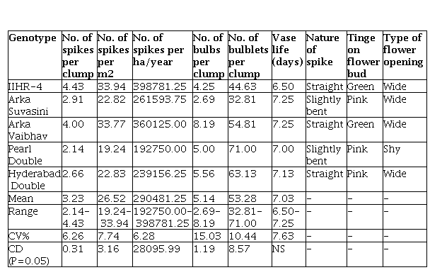 It is concluded from the above study for three consecutive years that among the cultivars evaluated for flowering, yield, quality and biotic stresses, the advanced breeding line IIHR-4 with superior flowering and quality parameters namely the double type florets on shorter spike and rachis, more number of florets open at a time on the spike, shorter intermodal length between the florets with compact floret arrangement, straight spikes with wide open florets and green tinge on flower buds makes the IIHR-4 as most ideal cut flower cultivar. It was also found to be highly resistant to root knot nematode M. incognita under field conditions with better field tolerance to Alternaria leaf blight disease.