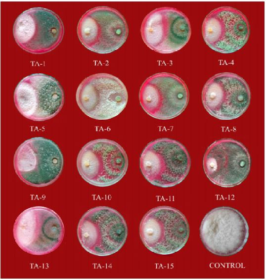 Antifungal assay was carried out to evaluate the antimicrobial efficacy of the potential isolates of Trichoderma spp. against the pathogen.