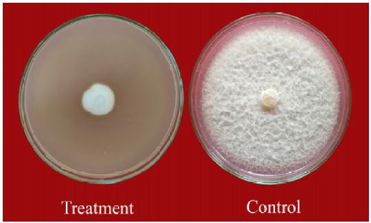 Mycelial plugs were taken from the freshly grown Trichoderma cultures and inoculated into conical flask containing fresh 100 ml potato dextrose broth and incubated for 7 days at 150 rpm at 28oC (You et al., 2016). Supernatant of the cultures were collected and centrifuged at 9000 rpm for 10 min. Then the cell free filtrates were sterilized through a 0.22 µm millipore filters and mixed with unsolidified PDA medium at 10% (v/v) concentration. Uninoculated PDB was added to PDA with same ratio for control. Mycelial disc of the pathogen was placed in all PDA plates and kept for incubation at 28oC for 5 days. Reduction in mycelial growth of the pathogen was measured and per cent inhibiton over control was arrived by the formula of Sreedevi et al. (2011),