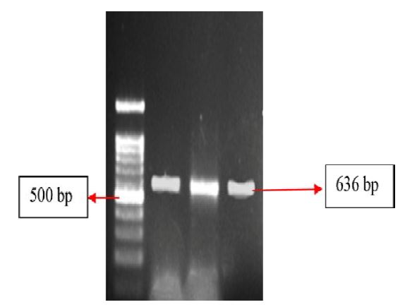 PCR of Trichoderma isolate with ITS-1 and ITS-4 primer pairs resulted in amplification of a fragment of size 636 bp (Fig 3).