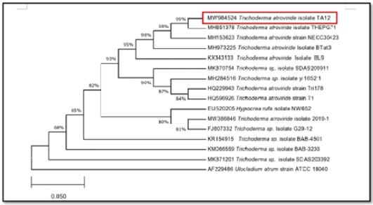 Phylogenetic analysis of the sequence (TA 12) with existing sequences in the NCBI database showed 99% sequence similarity with Trichoderma atroviride (Fig 4). The sequence was deposited in Genbank and obtained accession number (MW984524; Fig 5).
