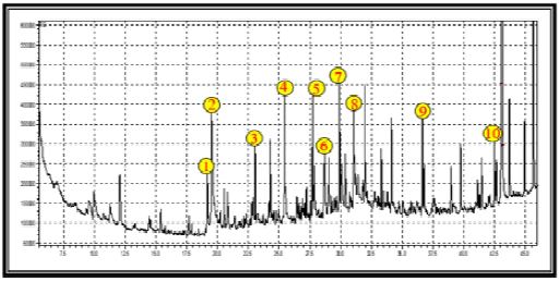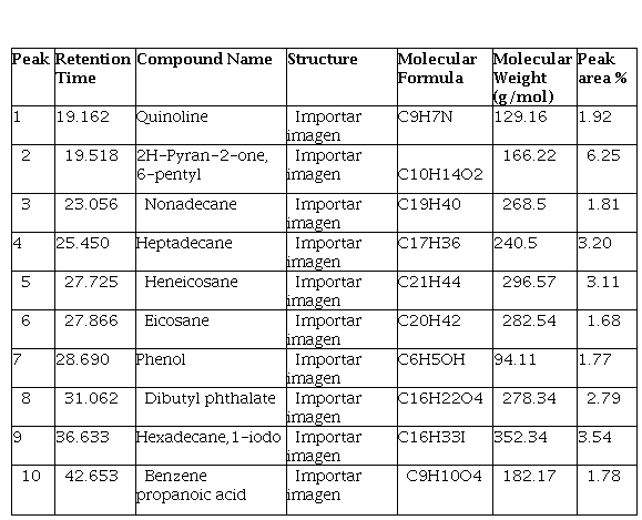 The extracts of T. atroviride were analyzed to determine its active chemical constituents. Active constituents of T. atroviride extract were demonstrated in Fig 5 and Table 3. The results showed that a numerous compounds produced by Trichoderma atroviride, possessing high antimycotic property.