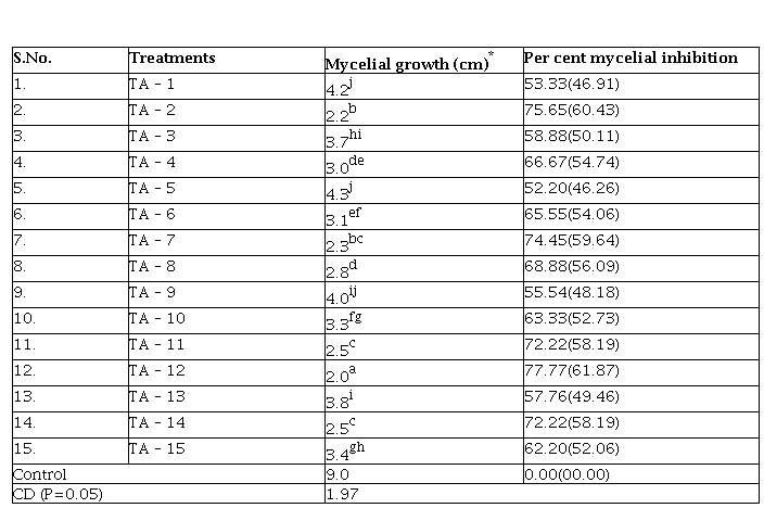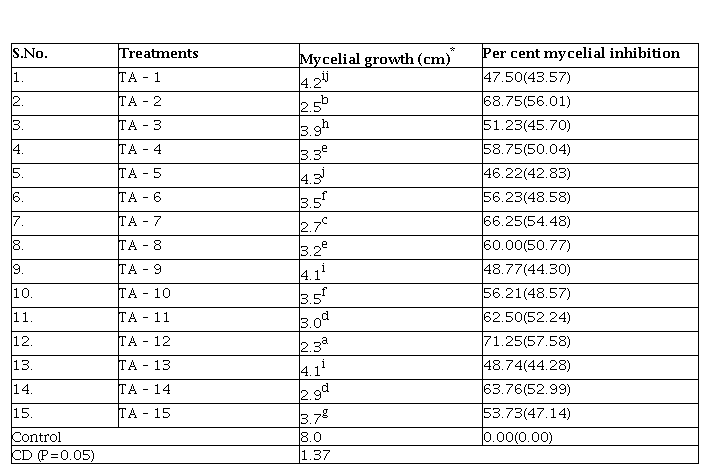 The experimental results revealed that all the isolates inhibited the mycelial growth of pathogen at significant level.. Among the isolates tested, TA12 showed the maximum mycelial inhibition of 77.77% (Fig 2).This was followed by the isolate TA 2 (75.65%). The least